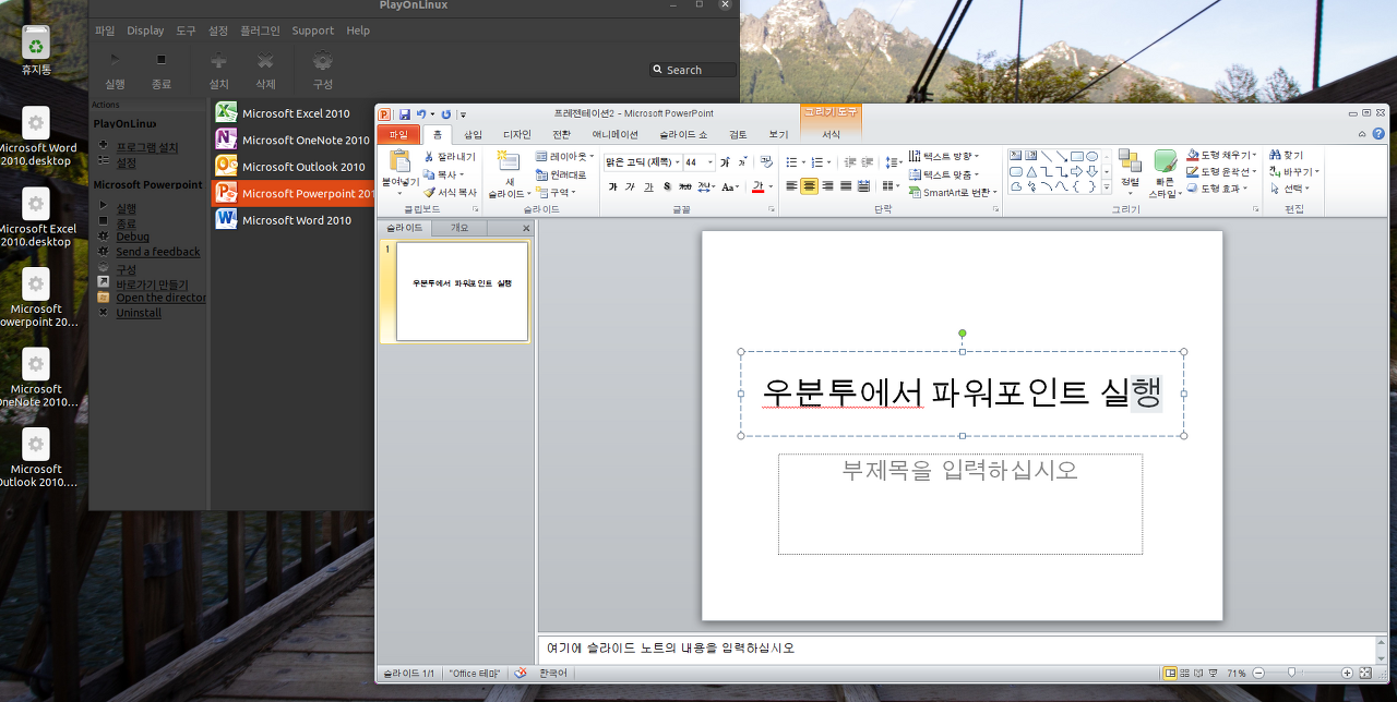 마지막으로 설치가 왼료되면 PlayOnLinux를 실행하면 바탕화면에 MS office 단축 아이콘을 자동으로 만들고 PowerPoint를 실행하면 정상적으로 동작한다.