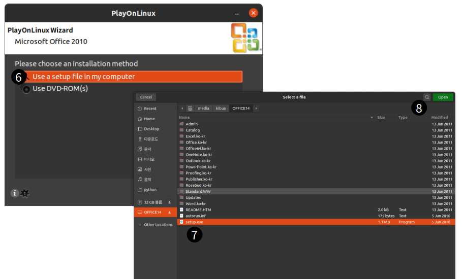 설치 선택 후 다음 화면에서 6) Setup file 또는 DVD ROM을 사용할지 선택한다. 7) MS office 2010 의 Setup.exe 파일을 선택하고 Open 한다. MS office 의 설치 프로그램이 ISO로 가지고 있는 경우 우분투에서 마운트할 수 있기 때문에 ISO 파일을 선택하면 파일 탐색기가 열리고 setup.exe를 선택을 할 수 있다. (아래 그림에서 'offfice 14' 드라이브)