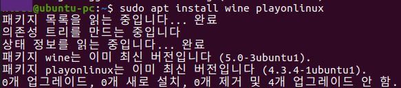 가정 먼저 wine 과 playonlinux 설치한다. 현 시점에서 wine은 5.0.3 버전이고, playonlinux는 4.3.4 버전이다.