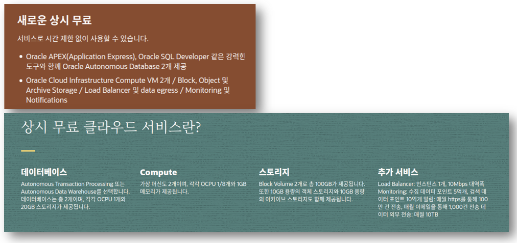 Oracle 홈 페이지에 게시된 무료 조건은 아래와 같습니다. VM에 대한 기본 spec은 앞서 Google Cloud와 비교했던 내용과 동일합니다. Oralce에서는 APEX와 SQL Developer 도구와 Load Balance 등을 지원한다고 합니다.