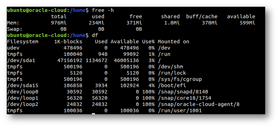 SSH 원격 접속하여 실제 가용한 리소를 확인하면 아래와 같이 1GB RAM, /dev/sda1에 마운트 한 50GB Storage 확인이 가능합니다. Oracle Cloud VM 생성 이후 HDD 추가, 고정 IP 할당, 방화벽 설정, SSH Key 등록은 추후 포스팅 예정입니다.