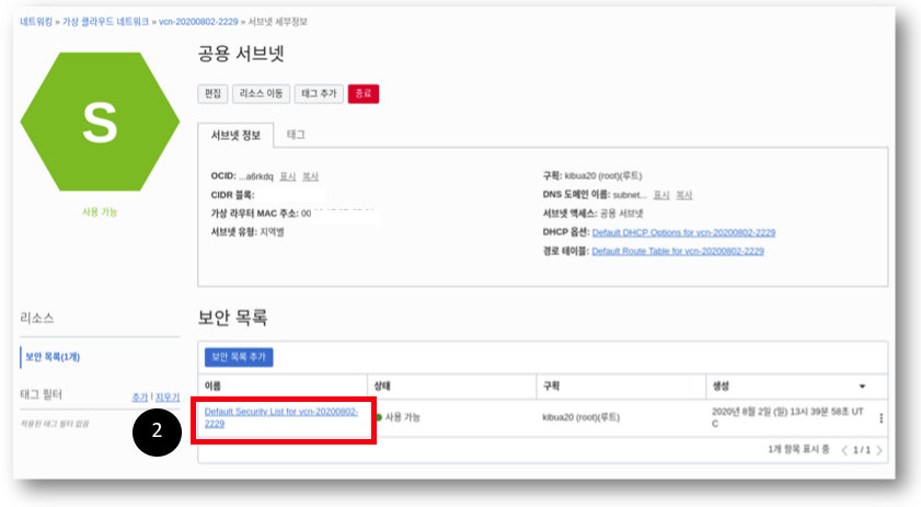 ② 공용 서브넷 세부 항목에서 보안 목록을 선택합니다.