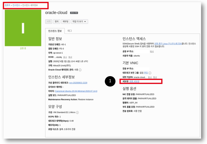 오라클 클아우드 로그인 상태에서 "컴퓨터" > "인스턴트" 메뉴를 선택하고 인스턴스 세부 내용에서 ① 서브넷을 선택합니다.