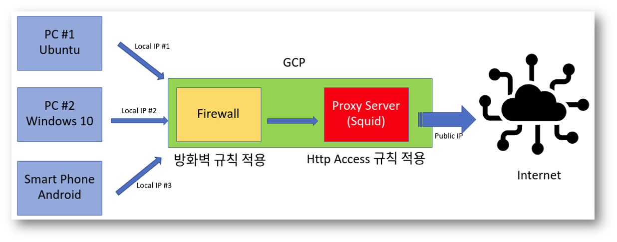 GCP에서 Proxy 서버 설정에 대한 전체적인 flow는 아래 그림과 같습니다. 앞서 설명한 내용의 Fowward Proxy 서버로 구성하고, 설치 툴로는 'Squid'를 사용할 예정입니다. PC (윈도우/ 우분투)에서 GCP 방화벽을 거쳐 Proxy 서버에 데이터 패킷을 전달하고 인터넷 망으로 접속할 예정입니다. 각 항목별로 아래와 같은 단계를 거쳐 설명합니다.