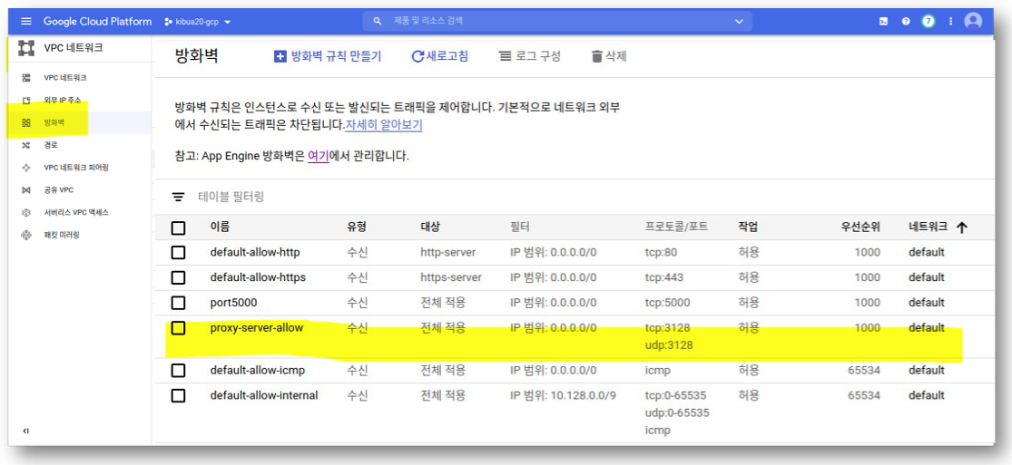 Squid에서는 모든 IP에 대해서 접속을 허용했고, GCP 방화벽에 proxy server 프로토콜의 방화벽 규칙을 추가하여 외부 접속 권한을 조정할 수 있습니다. VM에 접속해서 VPC 네트워크 → 방화벽 →방화벽 규칙 만들기를 선택하여 방화벽 규칙을 추가합니다.