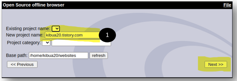 webhttrack 정상적으로 실행되었다면 브라우저에 프로젝트 화면을 표시하고 'Next'를 누르면 아래와 같은 화면을 보여줍니다.