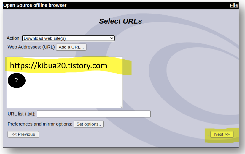 - 다운로드 사이트 입력: 다운로드하고자 하는 URL을 입력합니다. (https://kibau20.tistory.com)