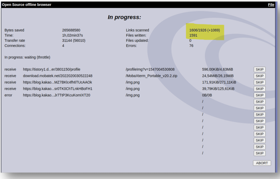 Website의 URL을 입력하고 백업을 시작하면 아래와 같은 Progress화면을 표시합니다. 제 블로그인 경우에는 1926개의 링크로 다운로드 시간은 1시간 넘게 소요됩니다. 다운로드 항목 4,190개이고, 파일 크기는 248.7 MB 정도됩니다.