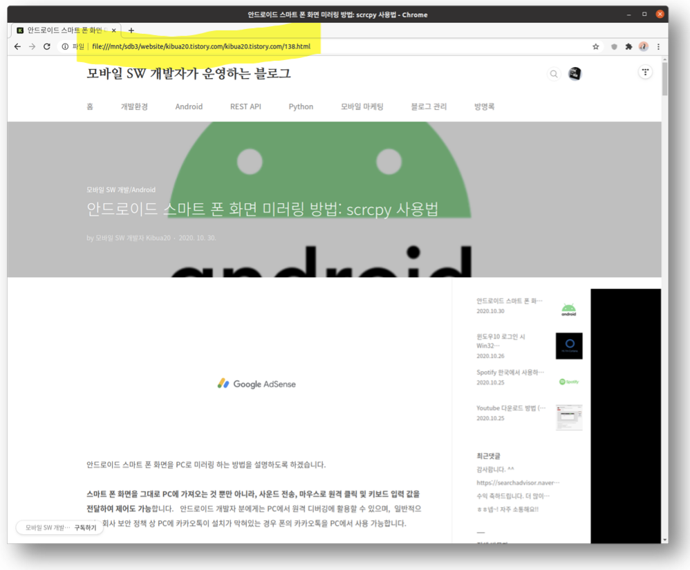 [모바일 SW 개발/Android] - 안드로이드 스마트 폰 화면 미러링 방법: scrcpy 사용법