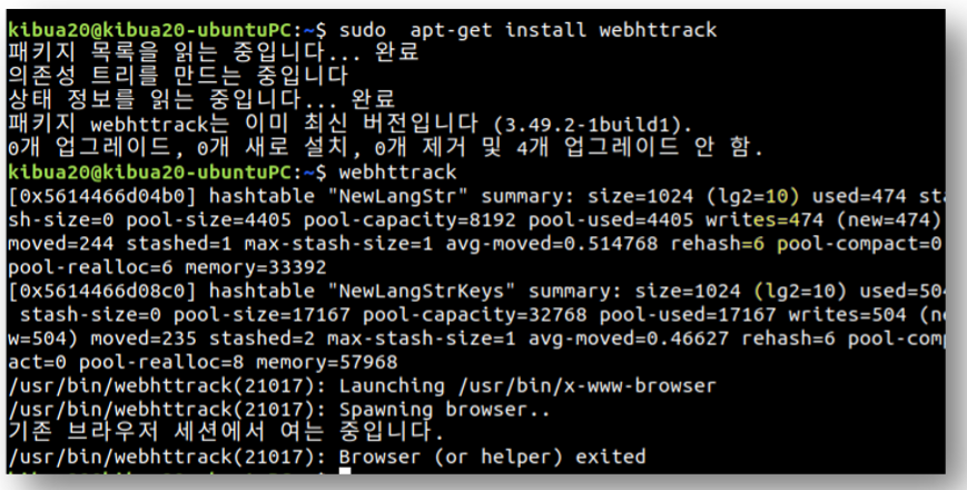 HTTrack 실행은 터미널에서 webhttrack을 실행합니다. 우분투에서는 실행 아이콘 생성되지만 에러가 발생하여 터미널에서 webhttrack을 직접 실행해야 합니다.