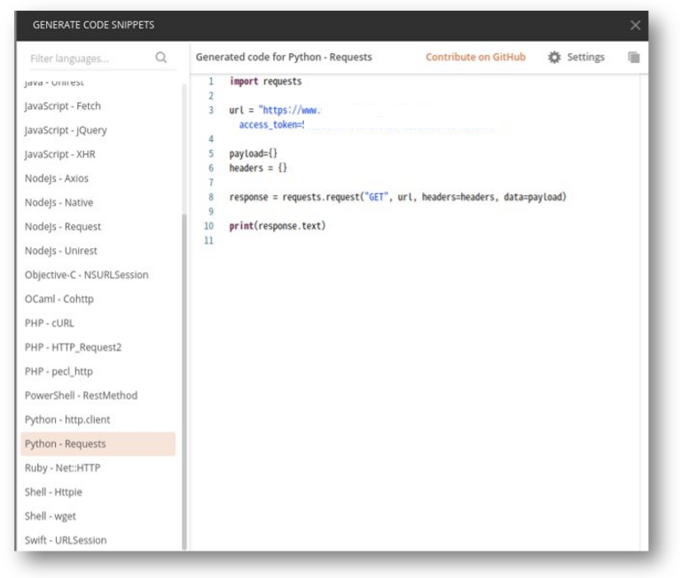 - Code로 변환: 개발하는 Client 프로그래밍 언어를 선택하고 code를 복사