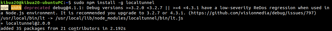 Localtunnel은 nodejs 기반으로 개발되어 있어 nodejs 패키지 매니저인 npm을 먼저 설치하고 localtunnel을 설치합니다. 설치 내용을 확인해보면 /usb/local/bin/lt 가 ../lib/node_modules/localtunnel/bin/lt.js의 symlink로 연결되어 있습니다.