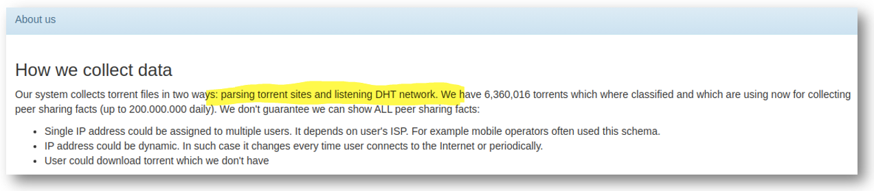 내용을 요약하면 ① 토렌트 사이트를 파싱하고 ② DHT(Distributed Hash Table) 네트워크의 모니터링을 통해서 개인정보를 수집한다고 합니다. 해당 사이트는 6백만 개 이상의 토렌트 파일을 분류하고 있고, 매일 2억 개 이상의 보내는 사람과 받는 사람의 IP 주소를 수집하고 있다고 합니다.
