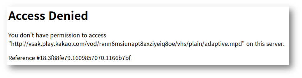 Access Denied: You don't have permission to access "http://vsak.play.kakao.com/vod/rvnn6msiunapt8axziyeiq8oe/vhs/plain/adaptive.mpd" on this server.