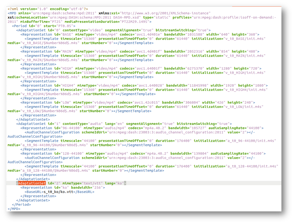 카카오 TV에서 사용하고 있는 MPD 파일은 아래와 같습니다. BASE, MAIN, HIGH, LOW 해상도에 대응하고 있는 video 파일과 audio 파일 정보, bandwith, 해상도 (width, height) 정보, codec 정보, start mumer, duration 등을 포함하고 있습니다.