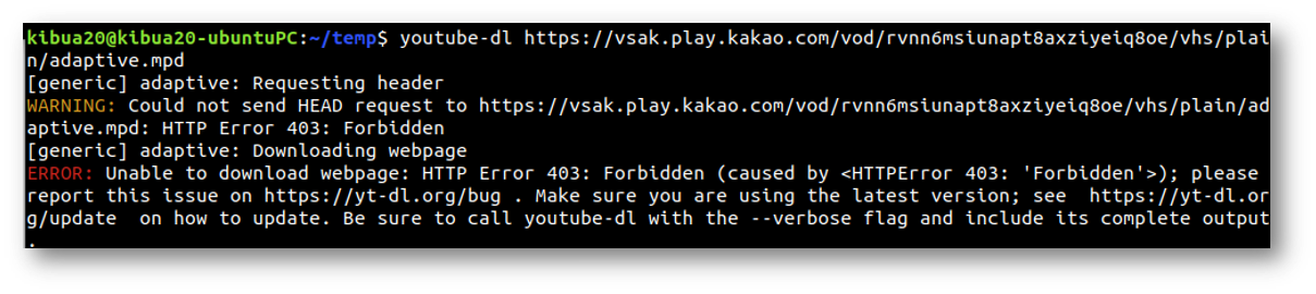 WARNING: Could not send HEAD request to https://vsak.play.kakao.com/vod/rvnn6msiunapt8axziyeiq8oe/vhs/plain/adaptive.mpd: HTTP Error 403: Forbidden
