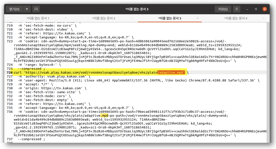 Copy all cURL 실행하고 텍스트 에디터를 열어서 복사합니다. 해당 동영상 web page에 서버와 주고받은 내용의 curl 명령어 형태로 모두 기록되어 있고 이 중에서 'adaptive.mpd'를 을 다운로드했던 curl 명령어를 찾습니다. curl 명령어 내용을 보면 User agent와 함께 authority, cookie (hash code)와 같은 서버 인증 정보가 그대로 포함되어 있습니다. 일반적으로 access token을 일정 시간만 유효하기 때문에 1시간 이상이 지났다면 다시 curl 명령어의 header를 다시 받아야 합니다.
