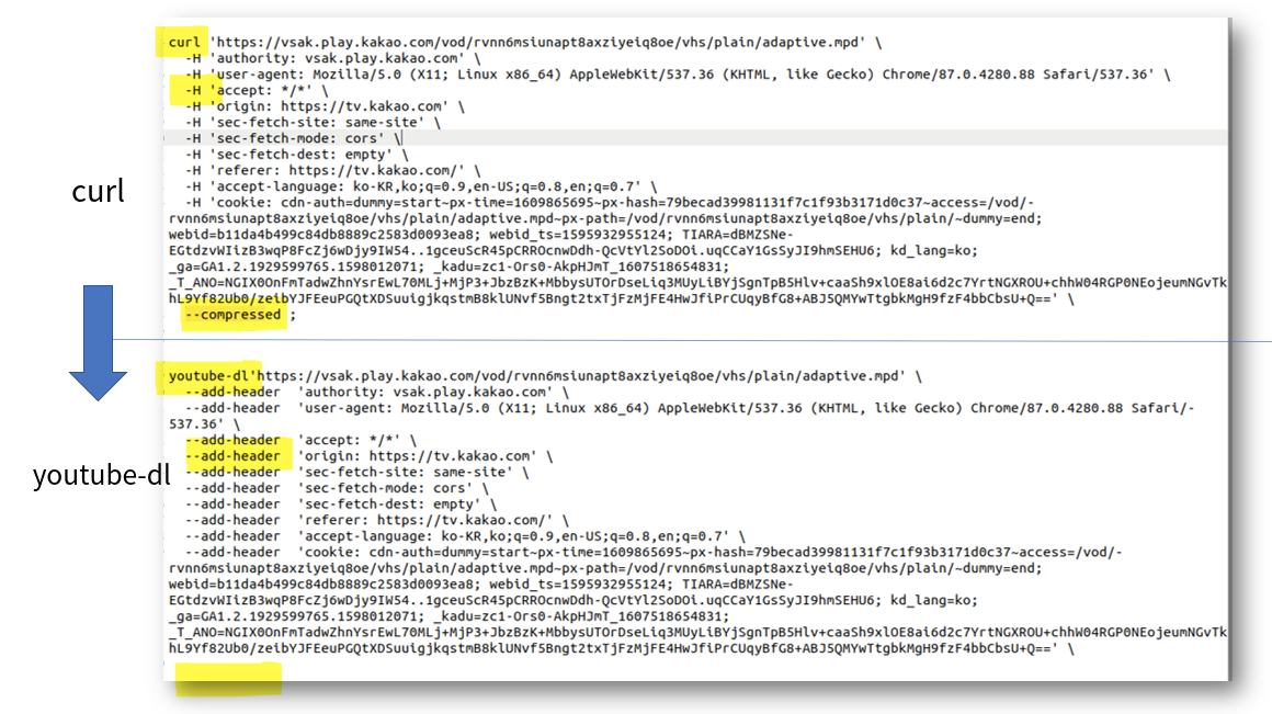 > --add-header 'cookie: cdn-auth=dummy=start~px-time=1609865695~px-hash=79becad39981131f7c1f93b3171d0c37~access=/vod/rvnn6msiunapt8axziyeiq8oe/vhs/plain/adaptive.mpd~px-path=/vod/rvnn.....e/vhs/plain/~dummy=end; webid=b1......a8; webid_ts=1595932955124; TIARA=dBM.......HU6; kd_lang=ko; _ga=GA1.2.1929599765.1598012071; _kadu=zc1-Ors0-AkpHJmT_1607518654831; _T_ANO=NGIX0OnFmT(....중략...)H9fzF4bbCbsU+Q=='