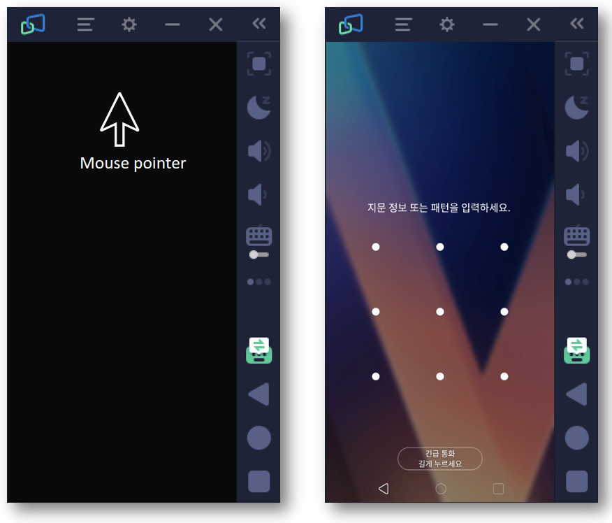 스마트 폰 미러링 프로그램들의 중요한 기능 중 하나는 "스마트 폰의 화면이 꺼져 있는 Deep sleep 상태에서 Disply On을 편하게" 할 수 있는 방법이 있어야 합니다. 기존에 Display On을 스마트 폰을 터치를 해야 했었으나, Mirroid에서는 직관적이고 아주 편리한 방법으로 Display On을 시킬 수 있습니다. PC에서 꺼진 화면 위에 마우스만 살짝 올리면 자동으로 Display On이 되고, 잠금 화면의 패턴도 마우스로 풀 수 있습니다.