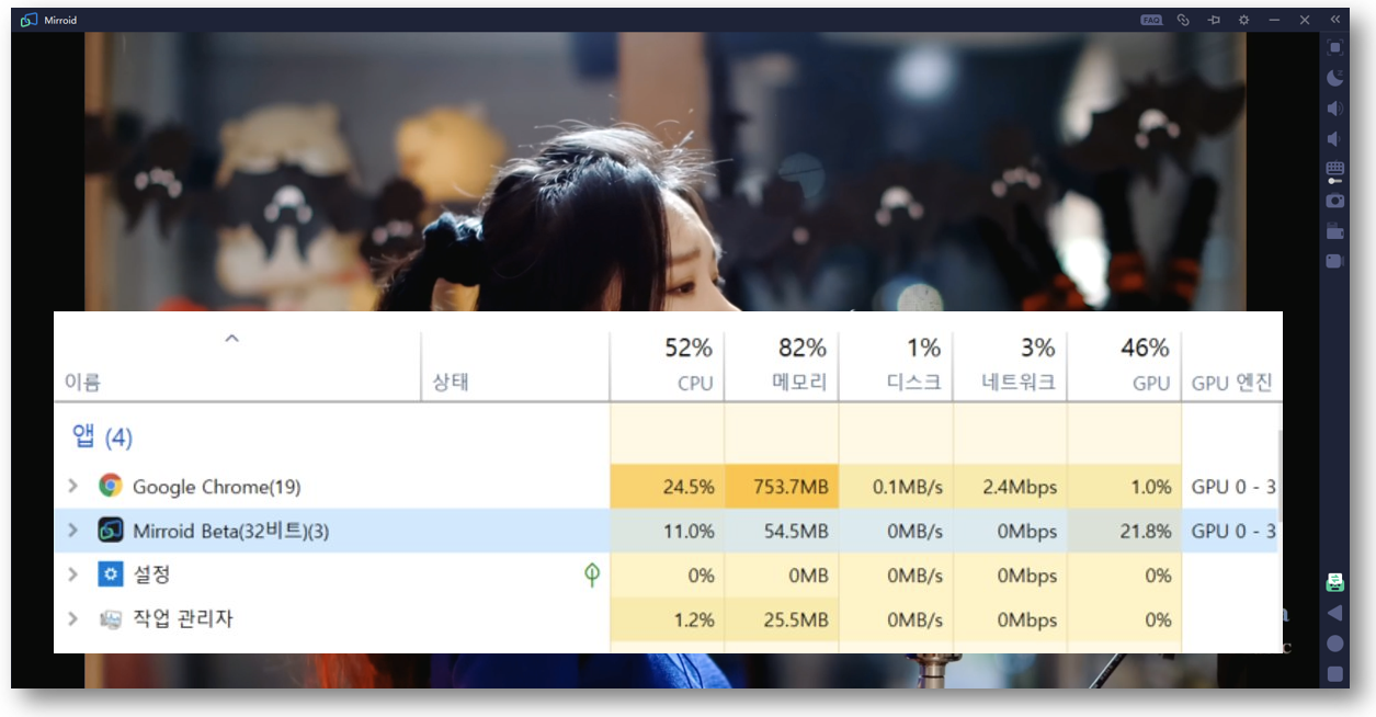 동영상 Play 시 Mirroid의 리소스 점유율을 보면 CPU 사용률은 11%이고, 메모리 사용량은 75MB 입니다. PC의 CPU와 RAM 영향이 거의 없어 프로그램이 아주 가볍게 동작합니다.