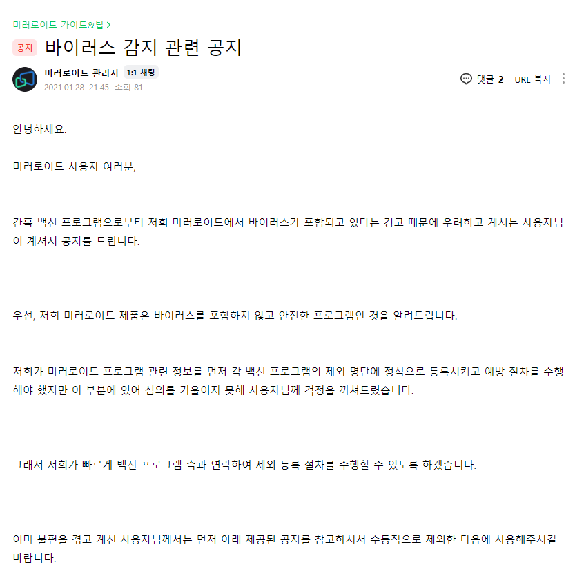 Mirroid windows용 Version 1.6.0.5 설치 파일 중 하나(MirroidUnistall.exe)에서 악성 코드인 트로이목마가 검출되었습니다. V3와 Window defender로는 검출되지 않고, 알약(다운로드 링크)으로 검출됩니다. 해당 파일의 악성 코드 진성여부와, 악성코드로 감염된 파일로 실수로 배포한 것인지 의도적으로 배포한 것인지는 알 수 없습니다. 악성 코드에 의해서 피해가 없도록 다운로드 시 주의 부탁드립니다. 알약으로 치료는 되지만 혹시 몰라 Windows OS를 다시 설치하였습니다. Mirroid 카페의 (cafe.naver.com/mirroid)에서 바이러스 공지 내용 참고하세요.