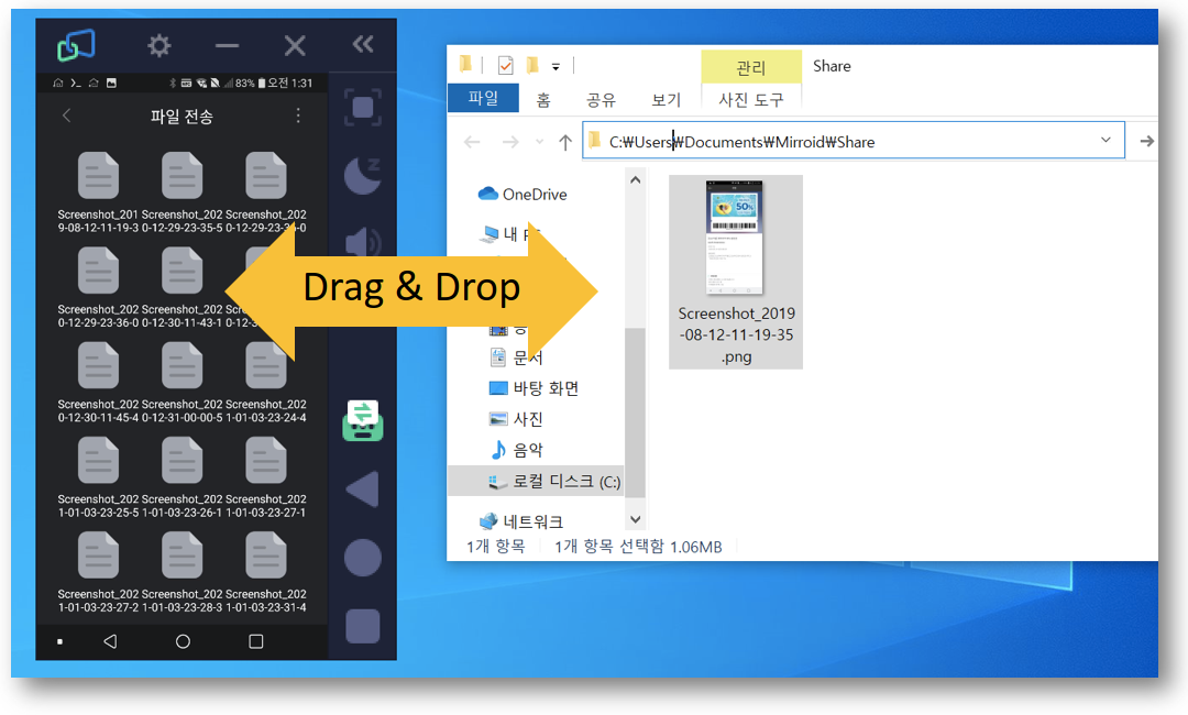 스마트 폰과 PC 간 파일 공유는 Drap & Drop으로 가능하고 미리 설정된 경로 저장됩니다. Android 개발자는 $ adb push 명령어나 MTP의 대안으로 사용할 수 있고, 일반 사용자에게는 Windows의 UX와 유사한 사용 경험을 줄 수 있습니다.