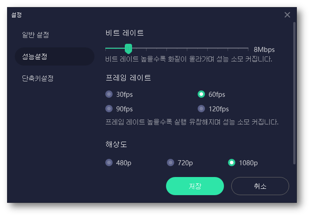 WiFi 무선 연결인 경우에는 공유기의 성능에 따라서 다소간의 화면 지연(latency)이 발생할 수 있습니다. 무선망 품질이 좋지 않은 경우에는 "성능 설정" 메뉴에서 Bitrate, FPS, 해상도를 조절할 수 있습니다. 제가 Test 했던 환경은 WiFi 5G Hz (802.11ac, 867 Mbps)의 무선 환경과 LG V30 QHD 단말이며, 8MB, 60 fps, 1080p에서도 latency 없이 잘 동작합니다.