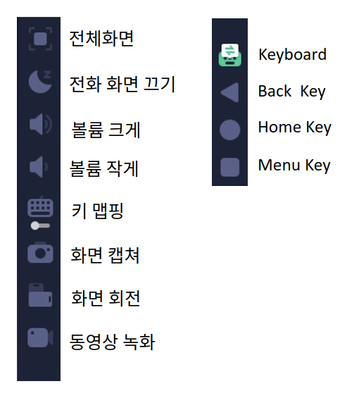 앞서 설명한 기능 이외에 전화 화면 끄기, 볼륨 조절, 키 맵핑, 화면 캡처와 동영상 녹화 기능과 함께 스마트 폰 하단의 Navigation Menu에 해당하는 Back Key, Home, Menu Key 가 지원됩니다. 동영상 녹화 및 캡쳐는 스마트 폰 화면을 PC에서 저장할 수 있는 유용한 기능입니다.