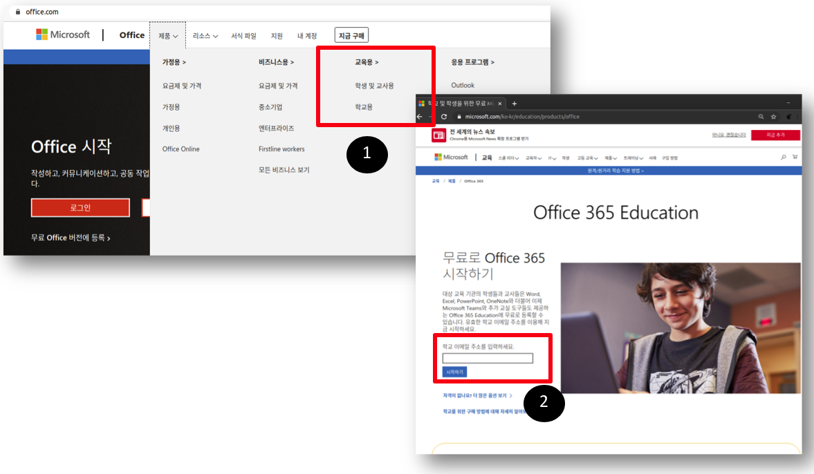 - https://www.office.com 에 접속해서 제품 > 교육용 > 학생 및 교사용 (가정용으로 등록하면 무료 서비스 지원되지 않음)
