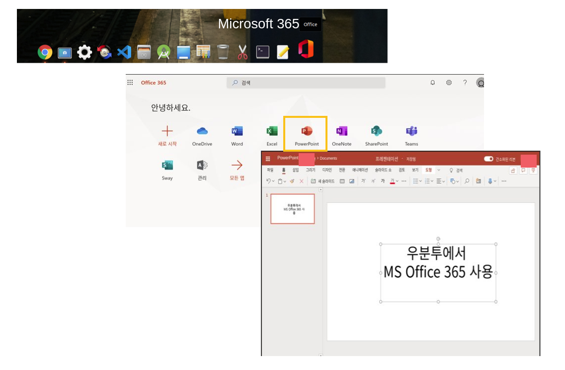 계정 등록이 완료되면 Chrome 에서 One Drive 및 Microsoft에서 제공하는 프로그램들이 보이고, 설치도 자동으로 진행다. 실제로는 Web 기반의 Cloud 프로그램이라 실제 응용 프로그램들이 설치가 되는 것이 아니고, 바탕화면에 아이콘 정도만 설치된다. 설치가 완료되면 바탕화면 Microsoft 365 아이콘도 생성하고 이를 통해서 Microsoft 365 사용이 가능하다. 우분투에서도 Windows Microsoft Office UI 와 동일하게 진입 경로를 제공한다. 물론 Chrome을 사용해서 Microsoft 365 URL을 접속하면 Cloud에 올린 문서 작업이 가능하다.