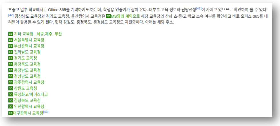 - Microsoft 365 (구 Office365) : MS 계정을 만들어야 한다. 가정용은 유료이지만, 학생/교사 email 계정은 무료로 사용 가능합니다. (각 지방 교육청의 계약 관계에 따라 다르지만 거의 모든 지역에서 무료 사용 가능)