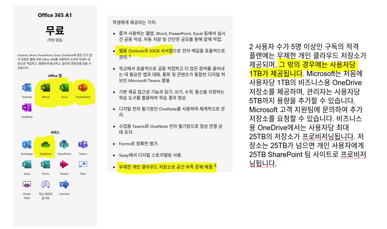 일반적으로 Microsft 365 (구 Office 365) 는 유료입니다. 한 달간 무료 계정을 사용하다가 이후부터는 유료로 전환해야 한다고 되어 있다. 유료 조건 때문에 거의 포기할 때쯤 "학생/교육자는 Microsoft 365 를 무료"로 제공하는 것을 확인하였고, MS office 뿐만 아니라 One Drive 저장공간도 1T 의 무제한 제공을 한다고 한다. 학생/교직원 계정에 필요한 사항은 학생/교직원임을 증명할 수 있는 email 만 있으면 된다. (※ 학교별로 각 지역 교육청과 MS 와 협약이 되어 있어야 함)