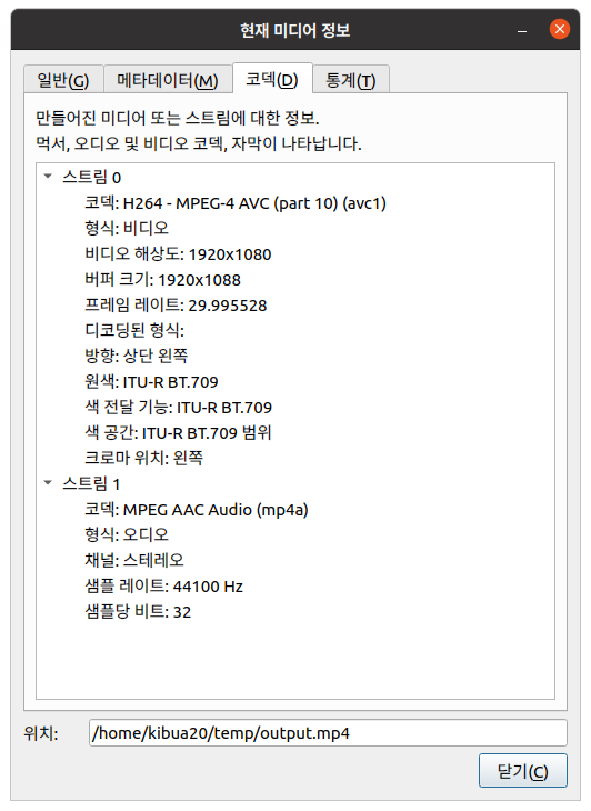 파일 하나로 합쳐진 output.mp4 동영상의 세부 정보는 아래와 같습니다.