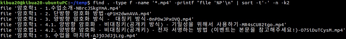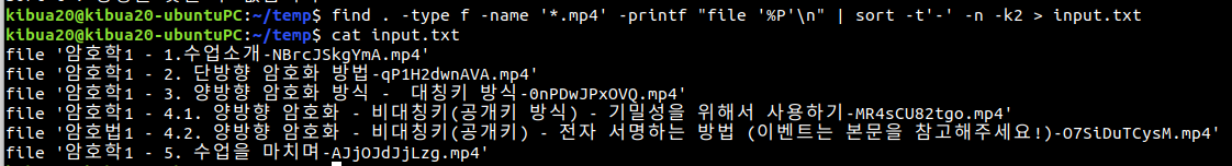 $ find . -type f -name '*.mp4' -printf "file '%P'\n" | sort -t'-' -n -k2 > input.txt 명령어는 sort의 결과를 input.txt 파일에 저장합니다.