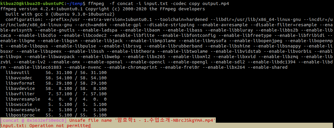 ffmpeg에서 파일을 합치는 옵션은 -f concat 을 사용할 수 있습니다. 하지만 이 명령어를 그대로 사용하는 경우 'Unsafe file name '암호학1 - 1.수업소개-NBrcJSkgYmA.mp4' 의 에러가 발생합니다.