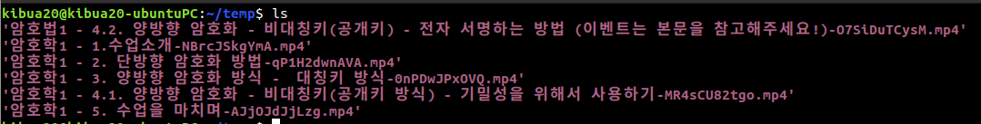 $ find . -type f -name '*.mp4' -printf "file '%P'\n" 만 사용 시 아래와 같이 결과를 출력합니다. 현재 폴더에서 확장자가 mp4 파일을 찾아서 "file <파일이름>"으로 출력합니다. 아래 결과를 보면 '2. 단방향 암호화' 가장 처음에 출력됨을 알 수 있습니다.
