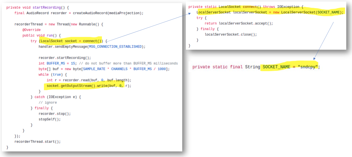 아래는 스마트 폰의 sndcpy.apk의 코드 중 일부입니다. Audio Recorder로 읽은 데이터를 linux socket으로 15ms 데이터를 모아서 writing 하는 역할입니다.