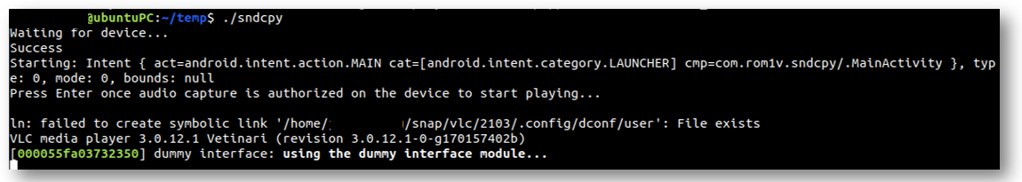 sndcpy bash script에서는 adb 연결하고 adb forward [Local] [Device] 명령어로 adb port forwarding을 구성한 다음에 sndcpy.apk의 Main Activity로 Intent를 날려 Apk에서 Audio capture를 triggering 하고 VLC demux 기능을 시작합니다.