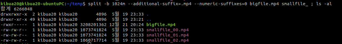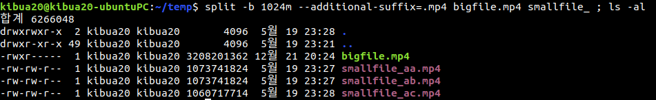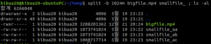 bigfile.mp4 1024MB 크기로 기준으로 smallfile_aa, smallfile_ab, smallfile_ac로 분할