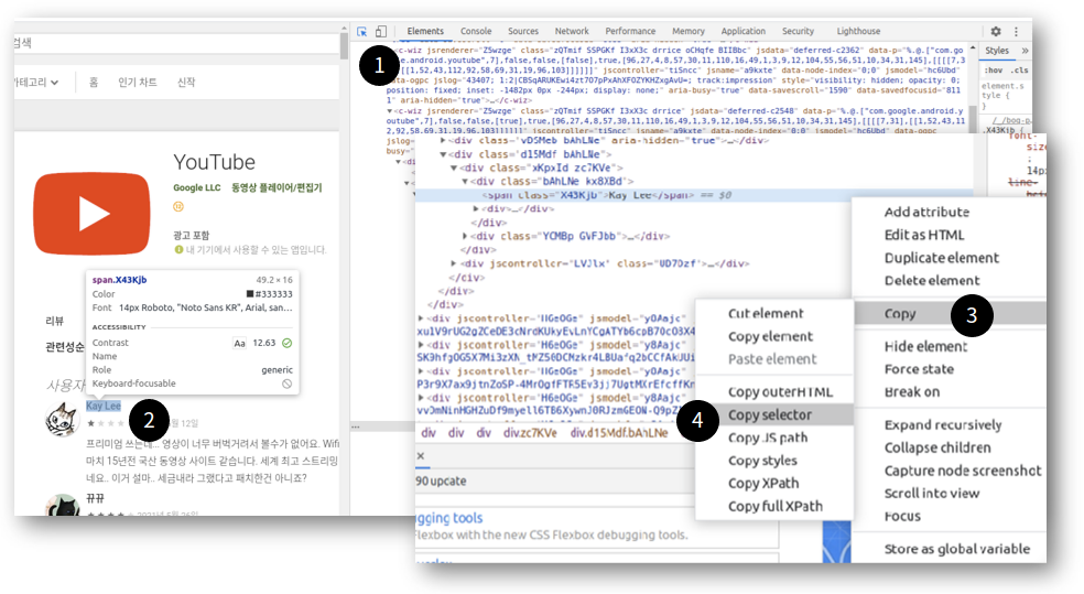 Google PlayStore 웹 페이지에서 ① 사용자, ② 별점, ③ 작성 날짜, ④ 좋아요 수, ⑤ 리뷰 내용을 추출하는 방법입니다.