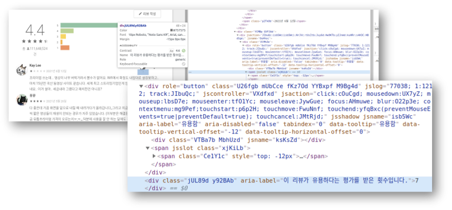 '좋아요' 개수 정보는 div (class = jUL89d.y92BAb) tag에서 attribute aria-label 값이 '이 리뷰가 유용하다는 평가를 받은 횟수입니다.' 값에 대한 text를 얻어 올 수 있습니다. 아래 예제에서는 '7' 값을 추출합니다.
