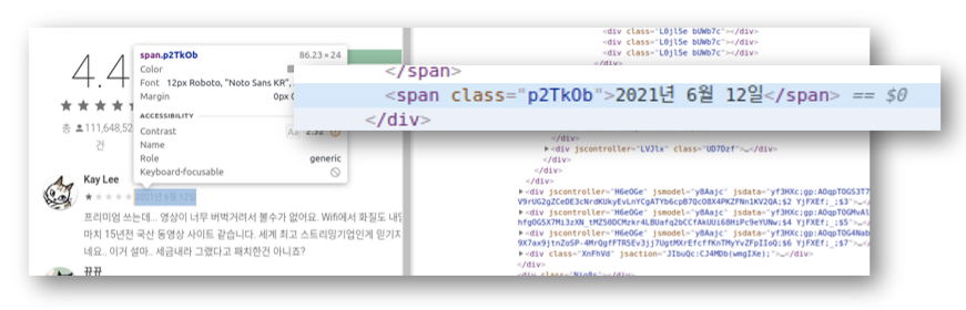'날짜' 정보는 span tag에 class = p2TkOb 값으로 추출합니다. 원하지 않는 값이 추출되는 것을 방지하기 위해서 상위 tag 인 div.bAhLNe.kx8XBd > div 인 경우로 한정합니다.
