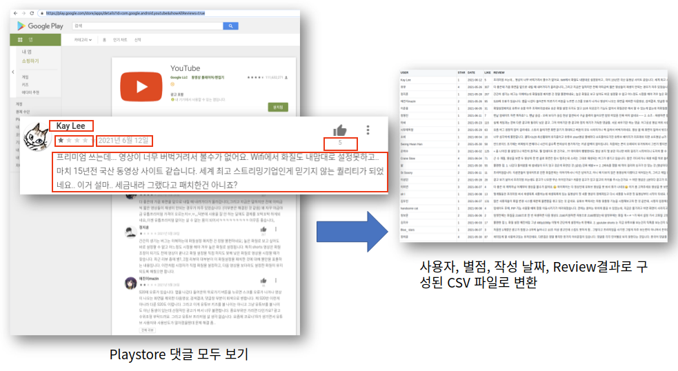 Google PlayStore 웹 페이지에서 ① 사용자, ② 별점, ③ 작성 날짜, ④ 좋아요 수, ⑤ 리뷰 내용 크롤링의 전체 코드는 아래에 예제와 GitHub에도 반영했습니다. 예제는 Youtube 앱이지만, Playstore의 다른 앱에서도 정상적으로 동작하며 id=com.google.android.youtube 부분을 크롤링하고자 하는 package name으로 변경하여 url을 전달하면 CSV로 저장됩니다.