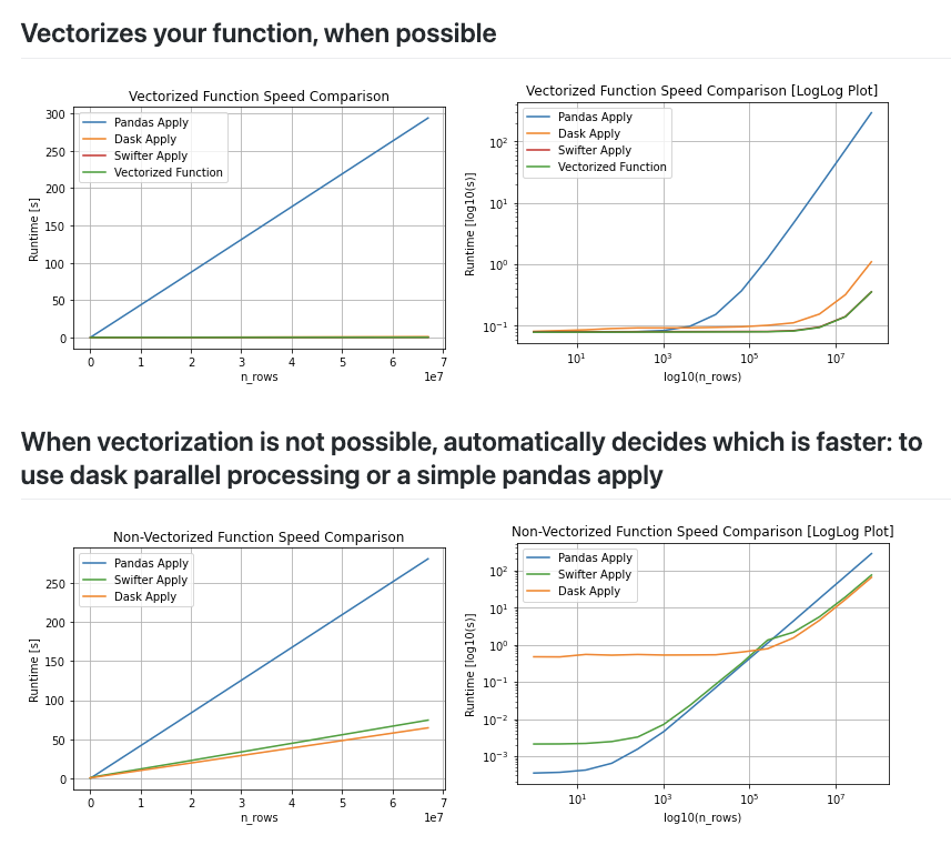 또한 Swifter GitHub에 공개한 측정 결과를 확인해보면 row의 개수가 1,000 이상이면 성능의 차이가 발생하기 시작하고, Dask 병렬 처리보다 Swifter가 우수한 결과를 보여주고 있습니다.