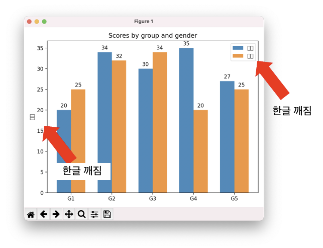 matplotlib에서 기본으로 사용하는 font는 영문 폰트(DejaVu Sans)입니다. 기본 설정 상태에서 한글을 표시하는 경우 아래 그림처럼 깨진 글자를 표시합니다.