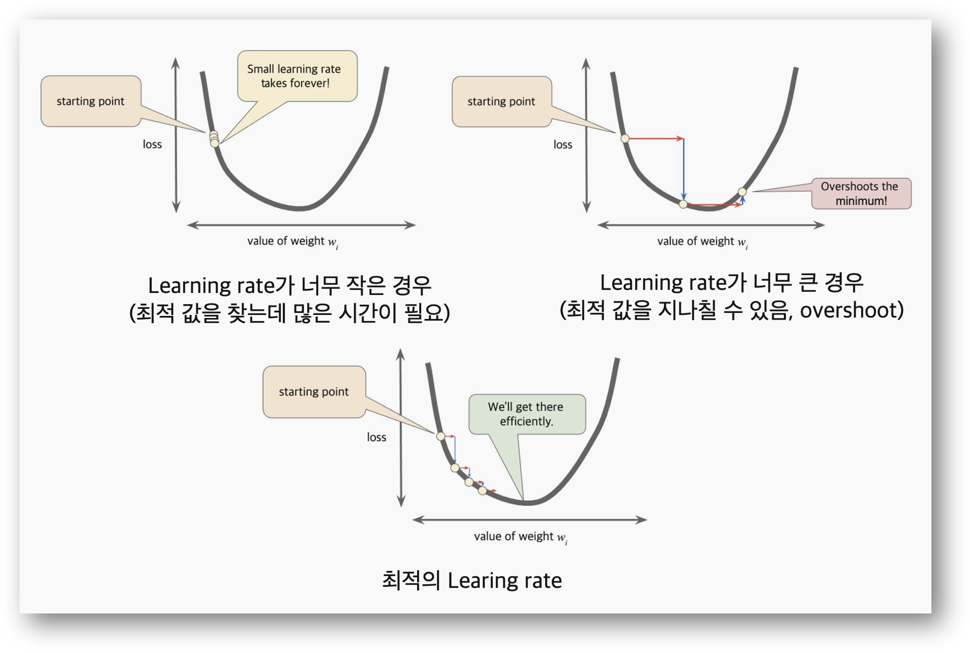 - Learning Rate (학습률, Step size)가 너무 작은 경우: 최적 값을 찾아가기 위한 연산 시간이 많이 늘어납니다. epochs 값이 낮은 경우 최적 값을 못 찾을 수도 있습니다.
