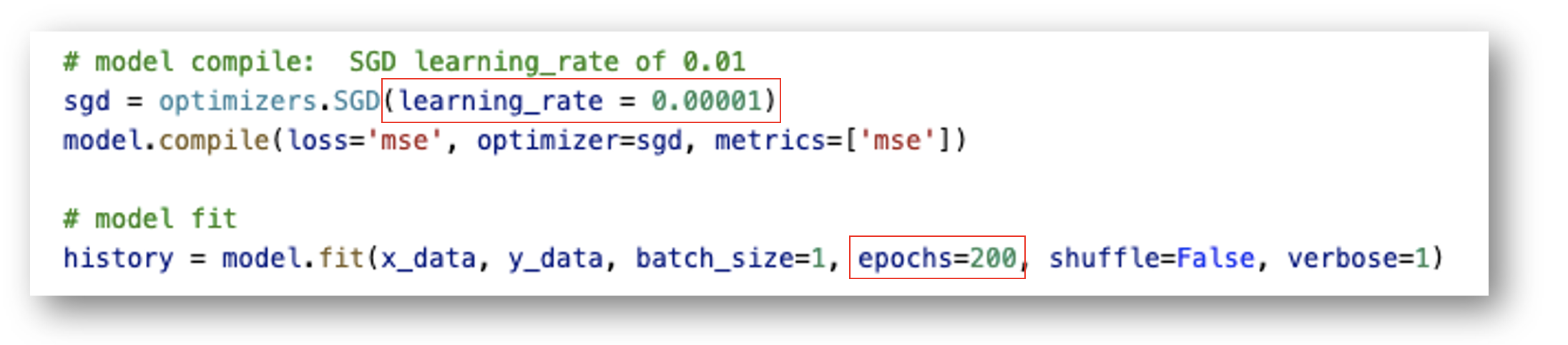 model.compile(loss='mse', optimizer=sgd, metrics=['mse'])