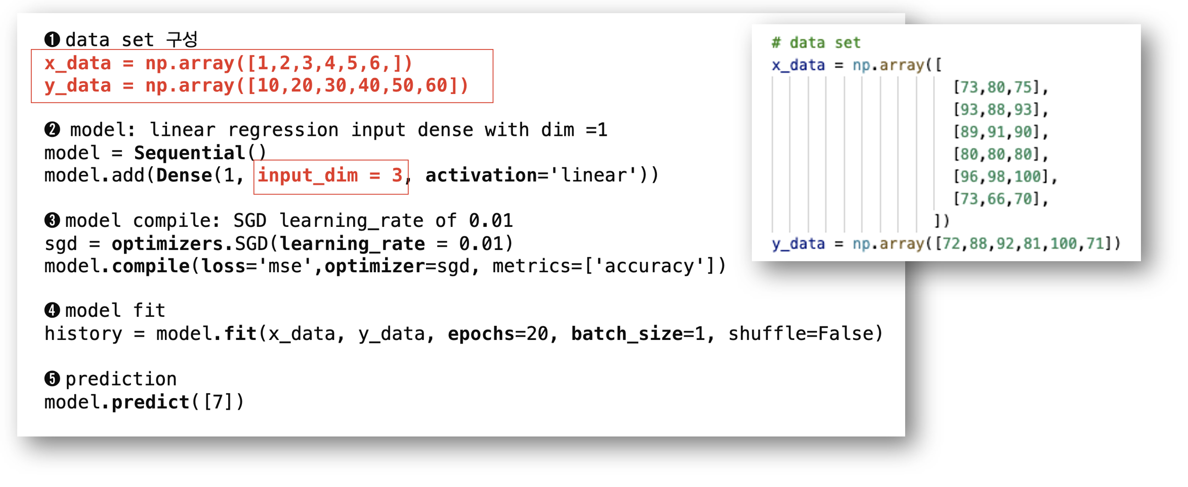 Python Keras 는 ① Data set 구성, ② Keras Model과 Layer 정의 , ③ Model compile, ④ Model Fit, ⑤ Prediction 과정으로 구성됩니다. 이 과정 중에서 ① Data set 구성, ② Keras Model과 Layer는 입력 데이터에 맞게 변경하고, 이후 과정을 Linear regression과 동일하게 유지합니다. ① Data set은 주어진 입력 값을 numpy arrary이 pandas dataframe 형식으로 입력합니다. ② Keras Model과 Layer는 Dense의 output dim 값은 1 개 이기 때문에 '1'을 그대로 입력하고, 입력 값 (독립 변수)는 1개에서 3개로 증가하였기 때문에 'input_dim=3'으로 입력합니다.