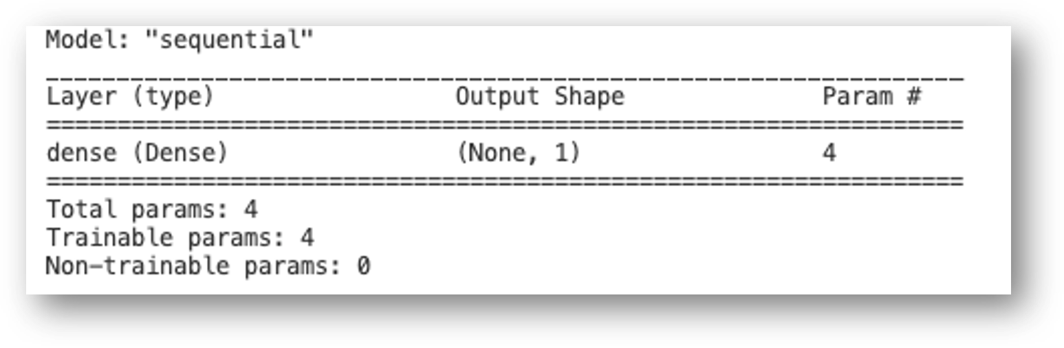 model.summary() 함수로 확인하면 아래와 같습니다. Output shape은 Linear regression과 동일하고 Training parameter가 4개로 (X1, X2, X3, constant) 증가했음 알 수 있습니다.