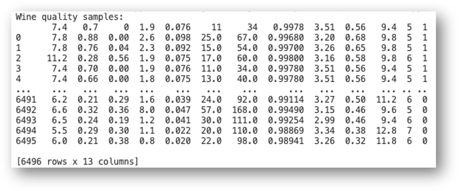 Wine Quality Sample예 대한 데이터 로딩하면 아래와 같습니다. Column index 없이 0 행부터 실제 값으로 채워져 있고, 행은 0부터 6495 개로 구성되어 있습니다.